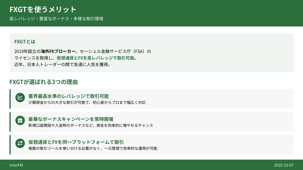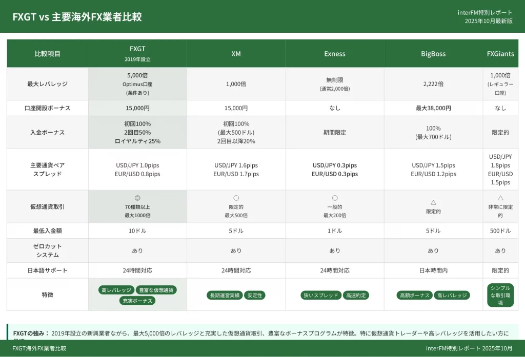 この記事では、FXGTの良い評判・悪い評判をSNSのリアルな口コミも含めて徹底調査し、運営会社の安全性や金融ライセンス、最大5,000倍のハイレバレッジや豪華ボーナスなどのメリット、スプレッドや出金面でのデメリット、XMやExnessなど他の人気海外FX業者との詳細比較、仮想通貨や株式などの取り扱い銘柄、さらにECN口座などの口座タイプや口座開設の手順、日本語サポート体制まで、FXGTのすべてを網羅的に解説しています。