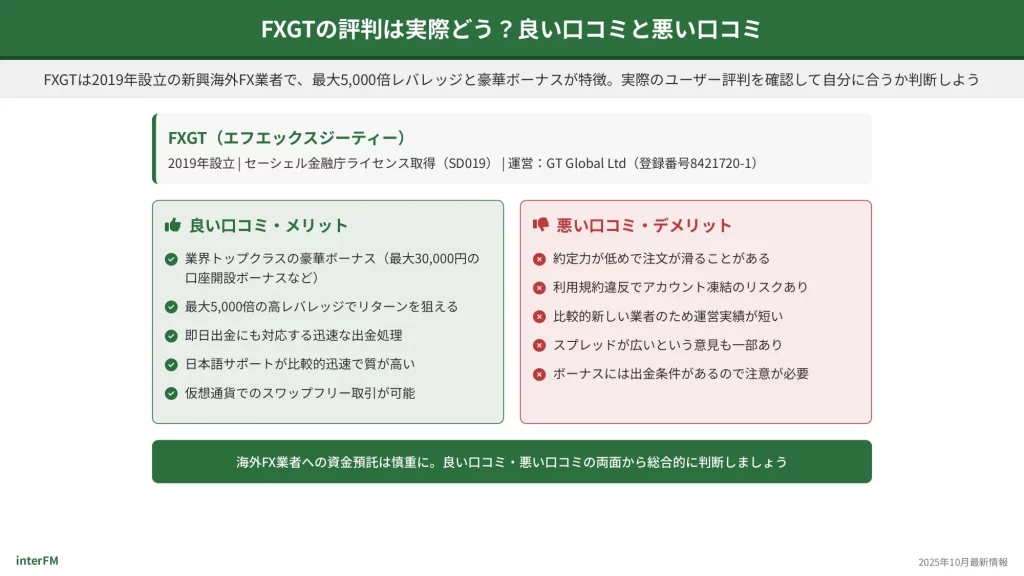 本記事では、FXGTに関する良い口コミと悪い口コミの両面を詳しく解説し、SNSでのリアルな評判も紹介します。