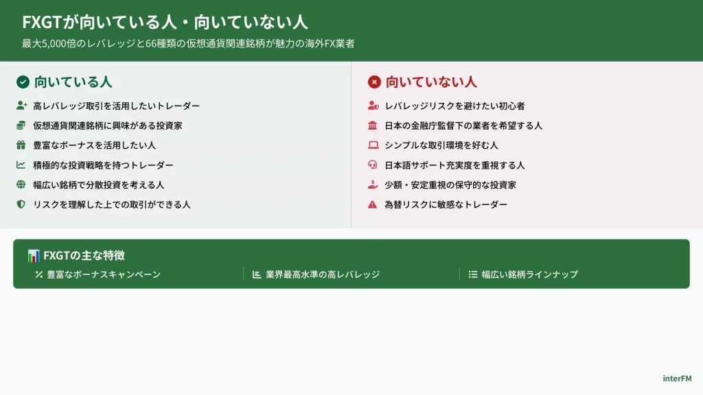 これらの情報を通じて、FXGTがあなたの取引スタイルに合っているかどうかを判断する材料を提供します。