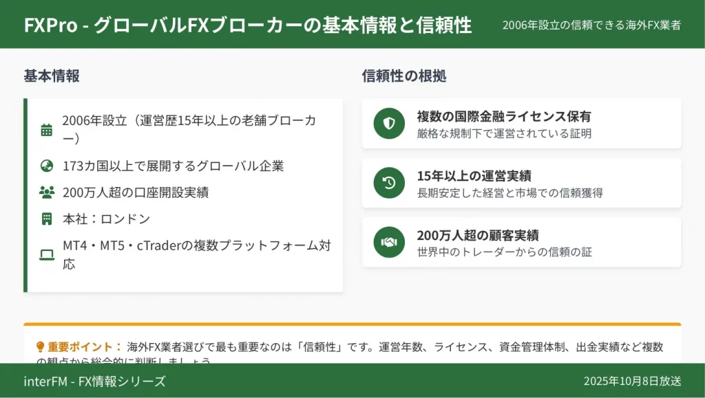 FXPro(FXプロ)は2006年設立、イギリスに本社を置く老舗の海外FX業者です。
