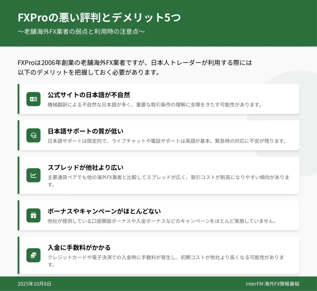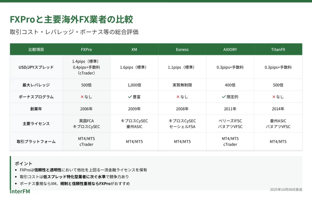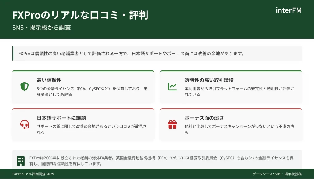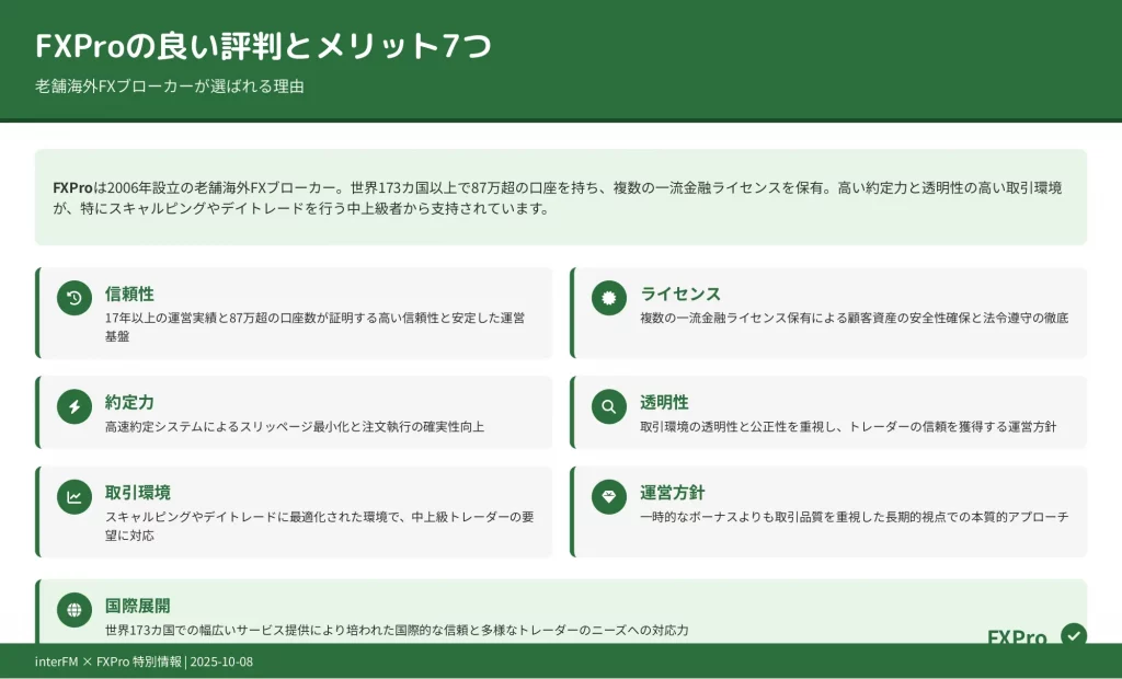 この記事では、2025年11月最新のFXProの評判を徹底調査し、金融ライセンスや出金実績などの信頼性、約定力・スプレッド・cTrader対応などのメリット7つと気になるデメリット5つを網羅して解説します。