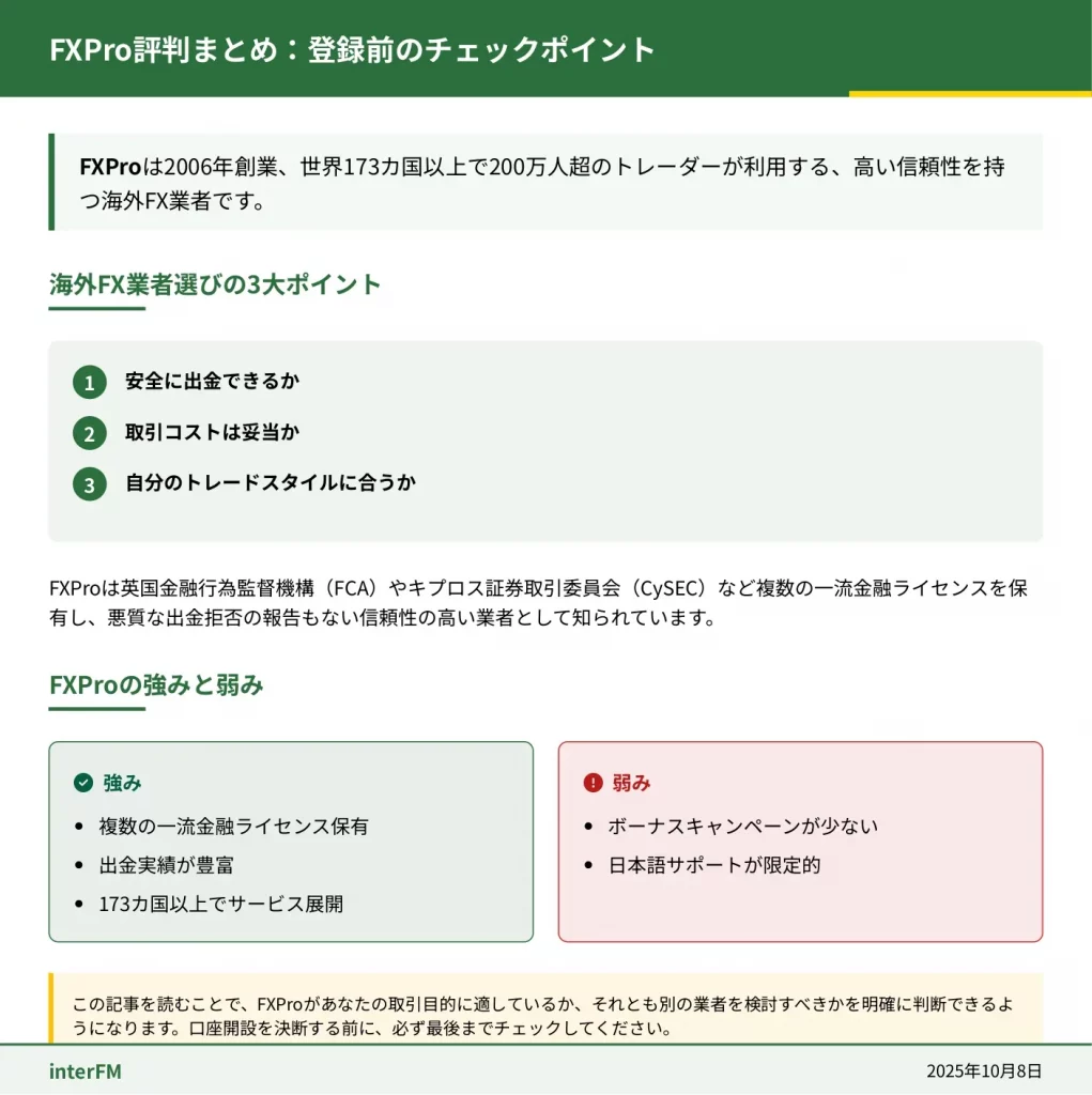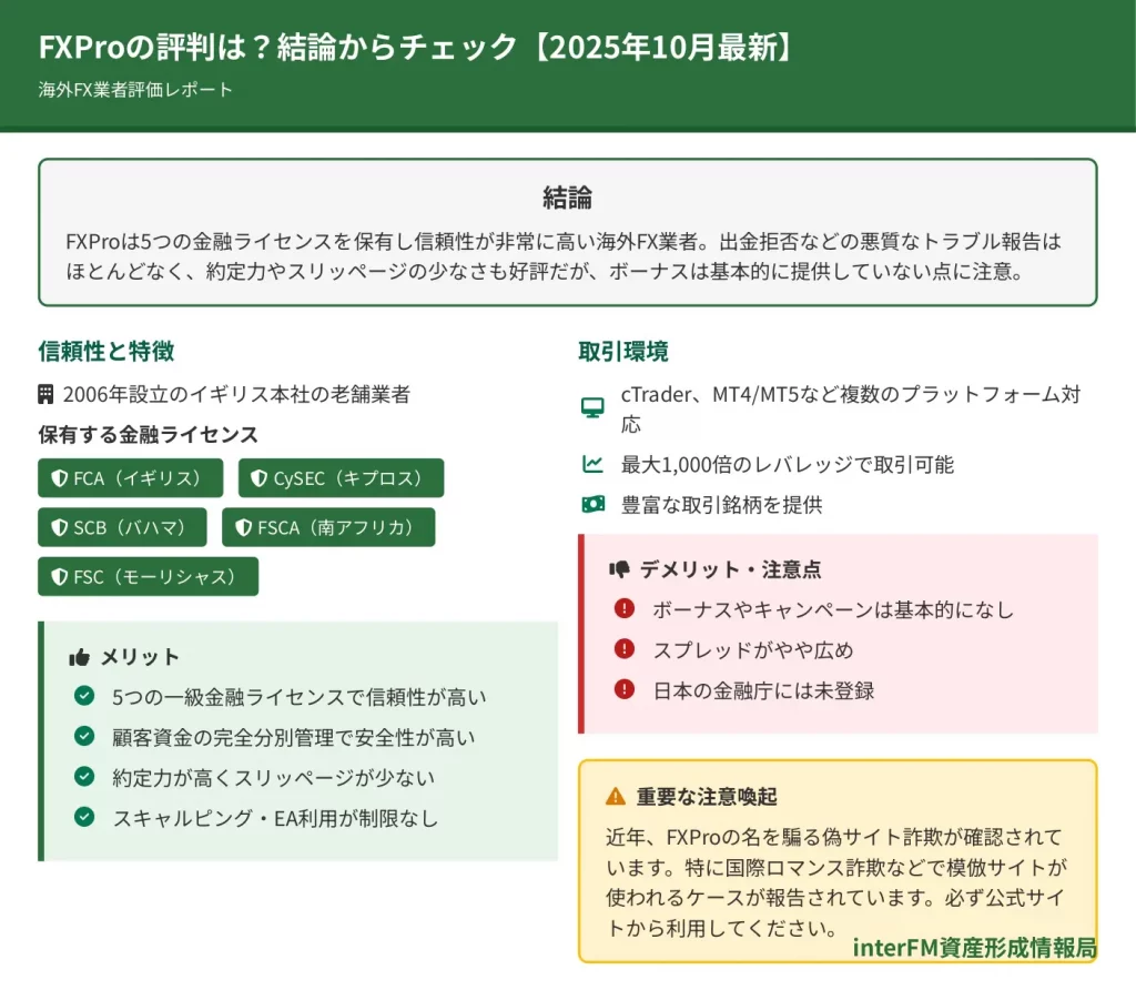 特にFXProは複数のライセンスを持つ老舗業者である一方、偽サイトの存在も報告されており、正しい知識を持って判断する必要があります。