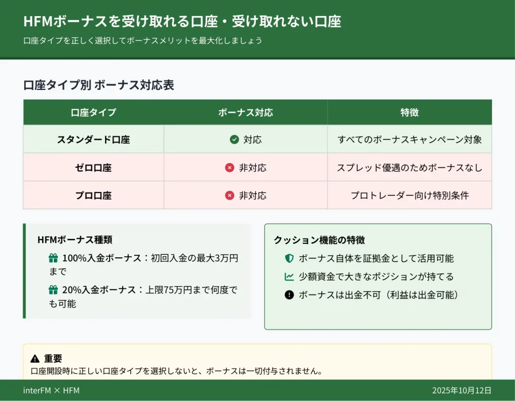 プレミアム口座、プロ口座、ゼロ口座、セント口座、HFコピー口座はボーナス対象外のため、これらの口座に入金してもボーナスは付与されません。