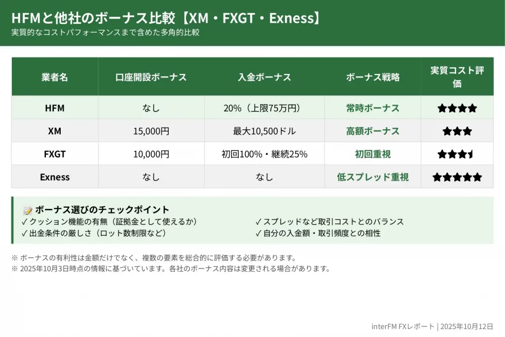 HFMの常時20%ボーナス(上限75万円)は、XMやFXGTの100%ボーナス枠を使い切った後でも継続的にボーナスを積み増せる点が差別化要因です。
