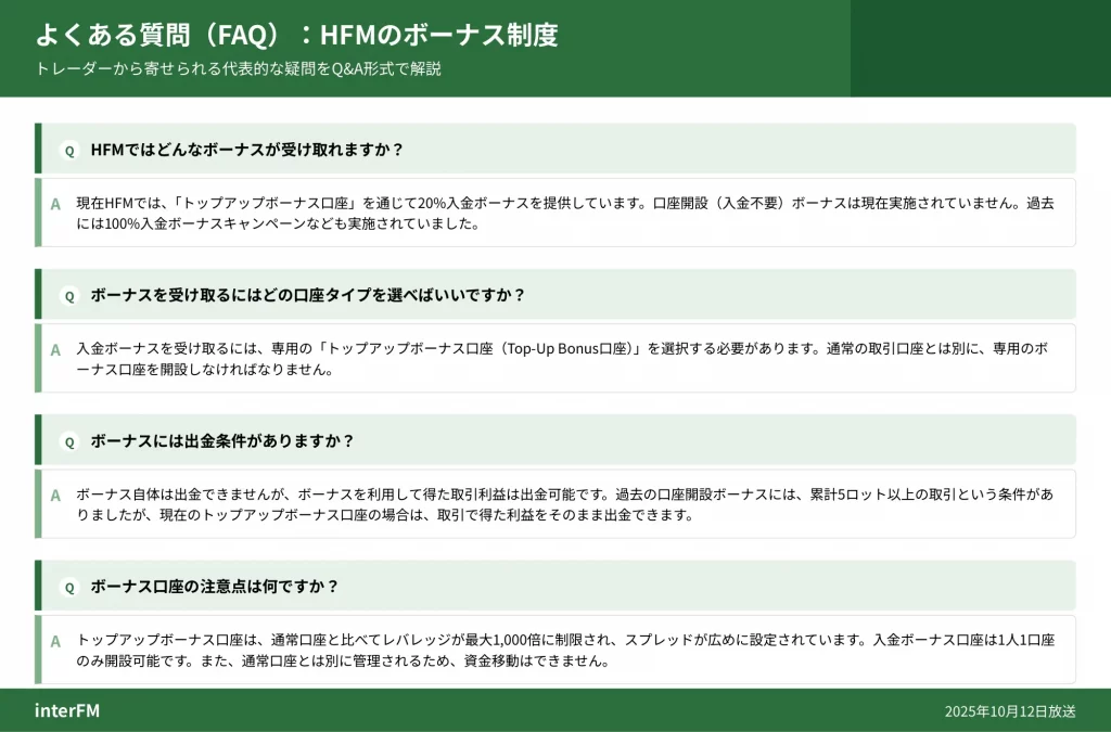 ボーナス割合「50%」という表記が一部で見られますが、これは過去のキャンペーンや他社との混同によるもので、2025年11月時点でHFM公式が提供しているのは20%と100%の2パターンです。
