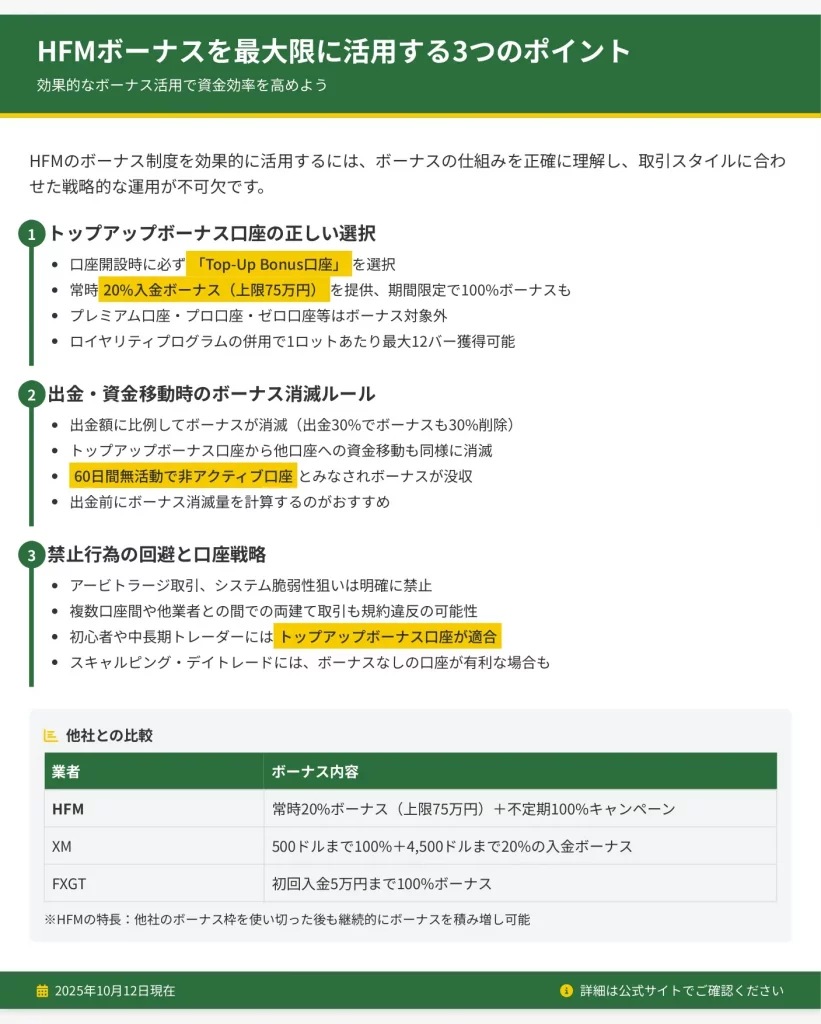 HFMのボーナスを効果的に活用するには、口座選択・出金ルール・禁止行為の3つを正確に理解することが重要です。