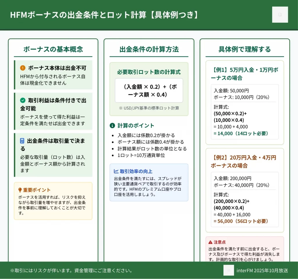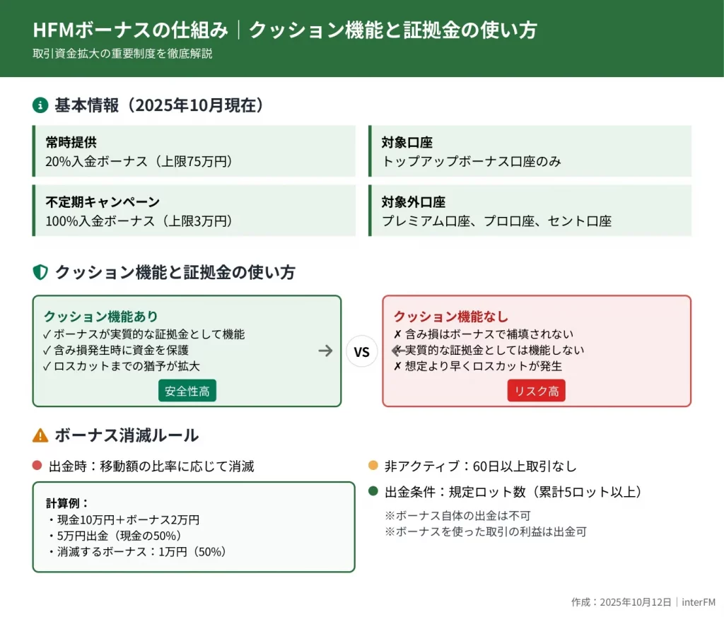 この記事では、2025年11月最新のHFMボーナス全種類(20%・50%・100%入金ボーナス、ロイヤリティプログラム)の金額と条件、クッション機能の仕組み、トップアップボーナス口座の特徴、口座開設から受け取りまでの4ステップ、出金時の必要ロット数計算方法、ボーナスが没収される禁止行為を具体例付きで解説します。