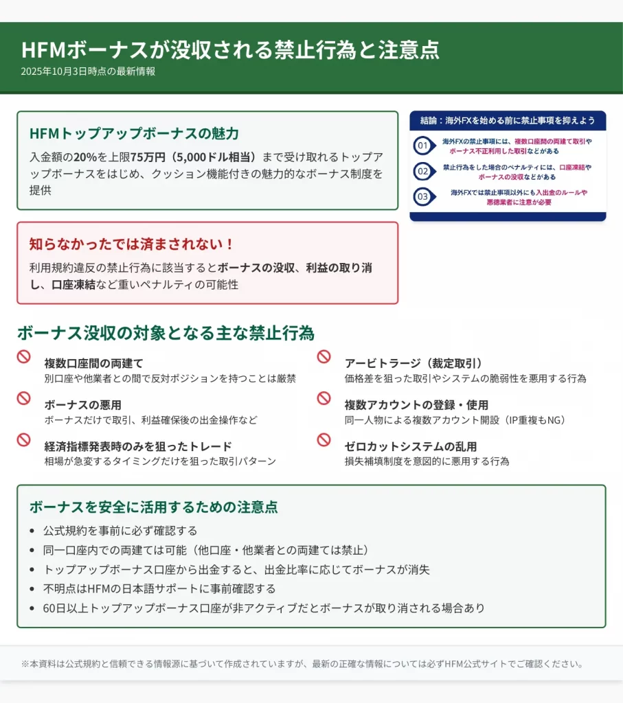 違反が発覚した場合、ボーナス没収だけでなく、利益の取り消しや口座凍結のリスクもあるため、公式利用規約を必ず確認しましょう。