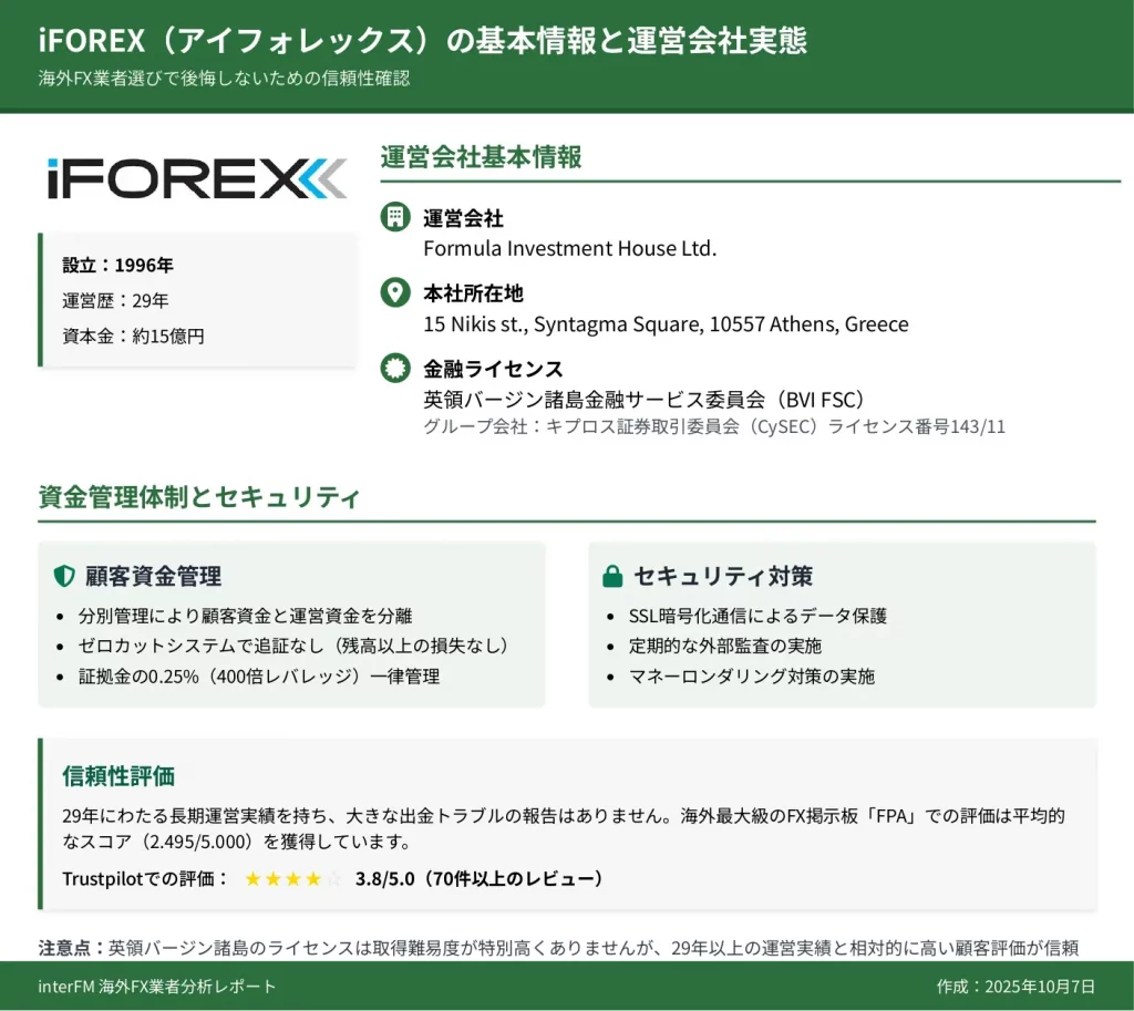 iFOREXは1996年に設立され、Formula Investment House Ltd.によって英領バージン諸島(BVI)で運営されている海外FX業者です。