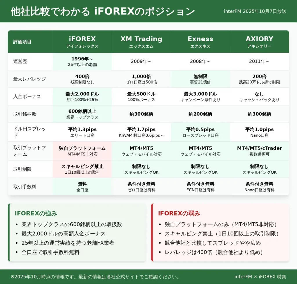 iFOREXを他の人気海外FX業者と比較すると、以下のような特徴があります。