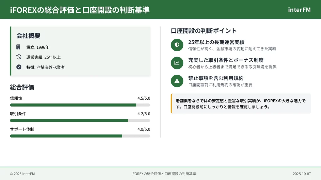 総合的に判断すると、iFOREXは長期運営の実績と金融ライセンスから一定の信頼性は認められるものの、独自ルールへの理解と許容が求められる業者といえます。