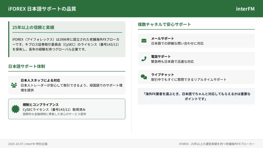 iFOREXは日本語サポートデスクを設けており、電話とメール、チャットで問い合わせが可能です。