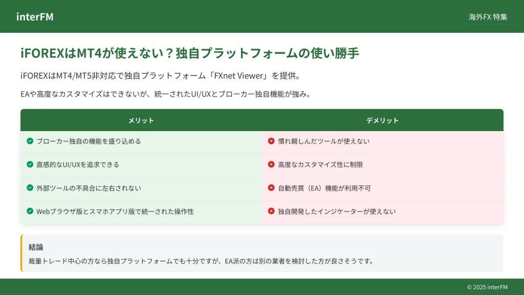 - プラットフォーム:MT4/MT5を使いたいなら他社を選択。独自プラットフォームで問題なければiFOREXで可