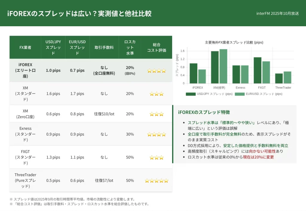 スプレッドはiFOREXの方が狭く(XMスタンダード口座はドル円1.6pips)、取引コストを重視するならiFOREXが有利です。