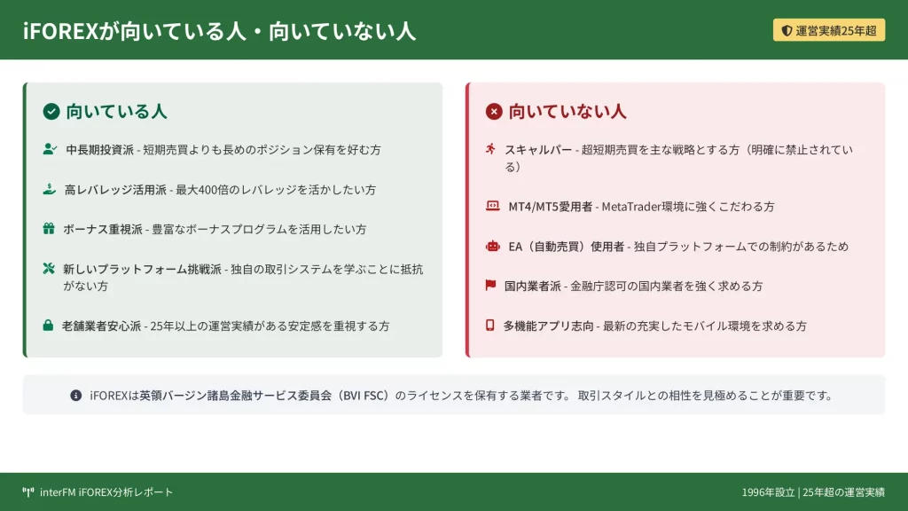 iFOREXは、トレーダーのスタイルや目的によって向き不向きがあります。