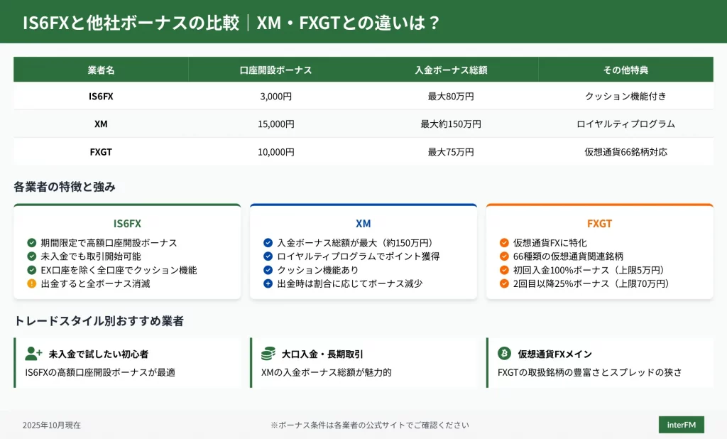 他社との比較では、XMTradingが初回入金100%ボーナス(上限500ドル)、FXGTが初回入金100%ボーナス(上限80,000円)を提供しており、IS6FXの入金100%ボーナス(上限6万円)は少し低い水準です。