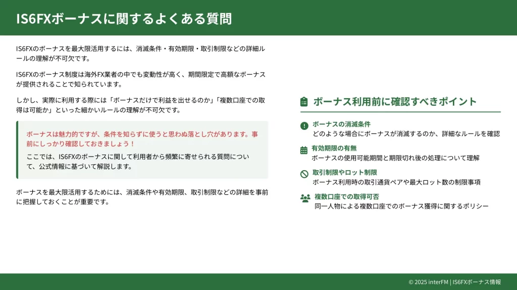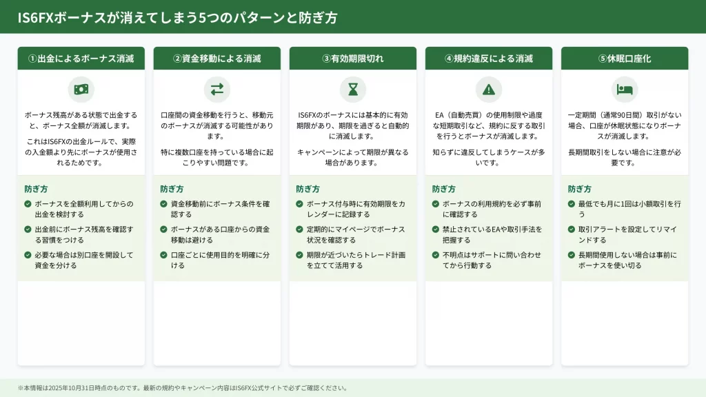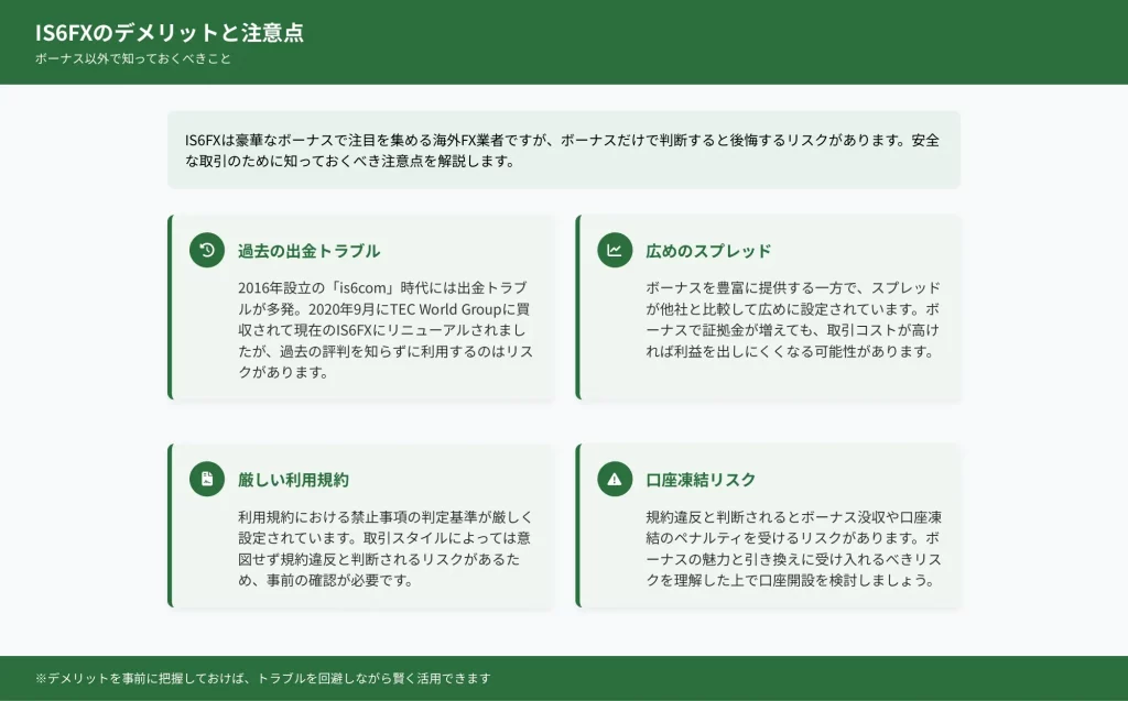 IS6FXは業界トップクラスのボーナスを提供していますが、出金時の消滅ルールやクッション機能、有効期限など複雑な仕組みを理解せずに使うと、せっかくのボーナスが無駄になったり、利益が出金できなかったりするリスクがあります。