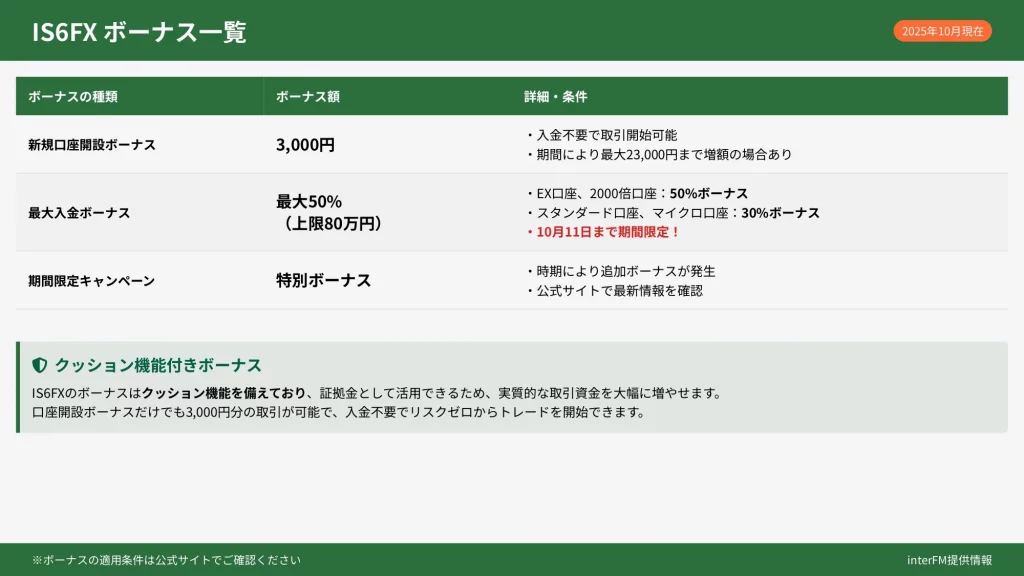 IS6FXのボーナスは2025年11月現在いくら?全種類を一覧で紹介