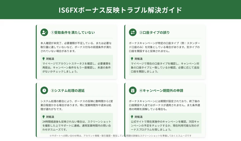 ボーナスが反映されない場合は、まず本人確認のステータスを確認し、必要に応じてIS6FXのサポートデスクに問い合わせることをおすすめします。