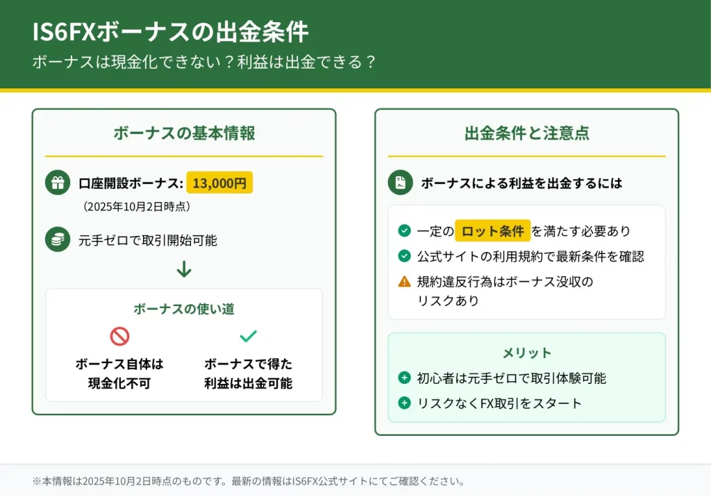 IS6FXではキャンペーン内容によってボーナス取引の出金条件が設定されている場合があり、条件未達成の状態で出金すると利益も出金できない可能性があります。