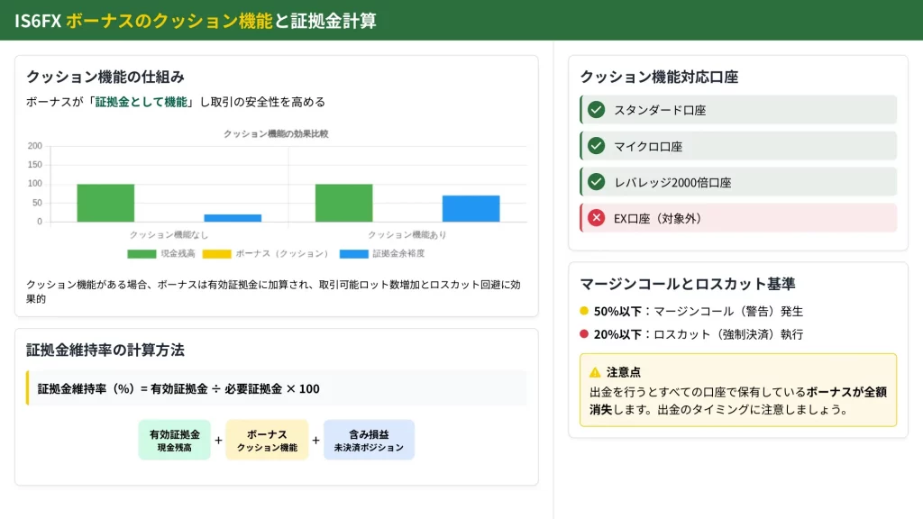 IS6FXのボーナスにはクッション機能が備わっているため、ボーナス分も証拠金として活用できます。