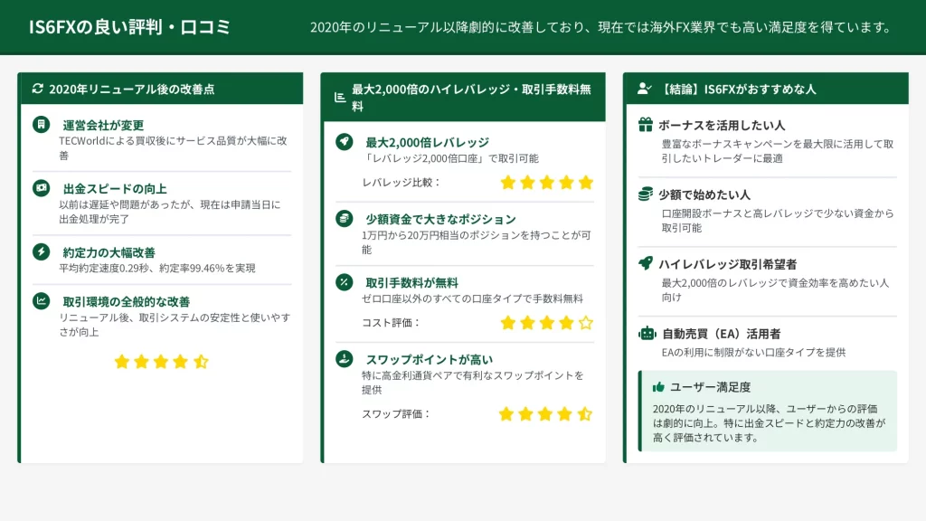 IS6FXは2020年のリニューアル以降、TECワールドグループの資本力(約50億円)をバックに前身「is6com」時代の課題を完全に解決し、現在では利用者から高い評価を獲得しています。
