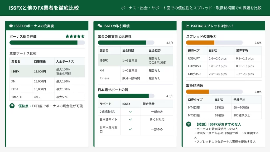 競合他社の中には、日本語対応と謳いながら実際には外国人スタッフが機械翻訳で対応するケースもある中、IS6FXの自然で的確な日本語対応は明確な差別化要因となっています。