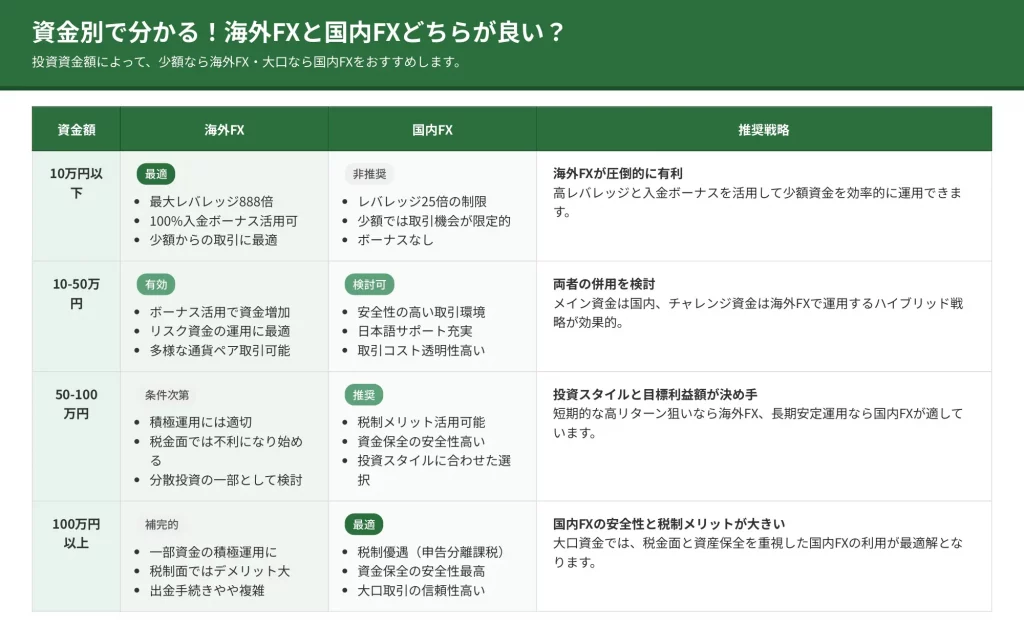 - 100万円超の大口資金:税制面と安全性から国内FXが合理的