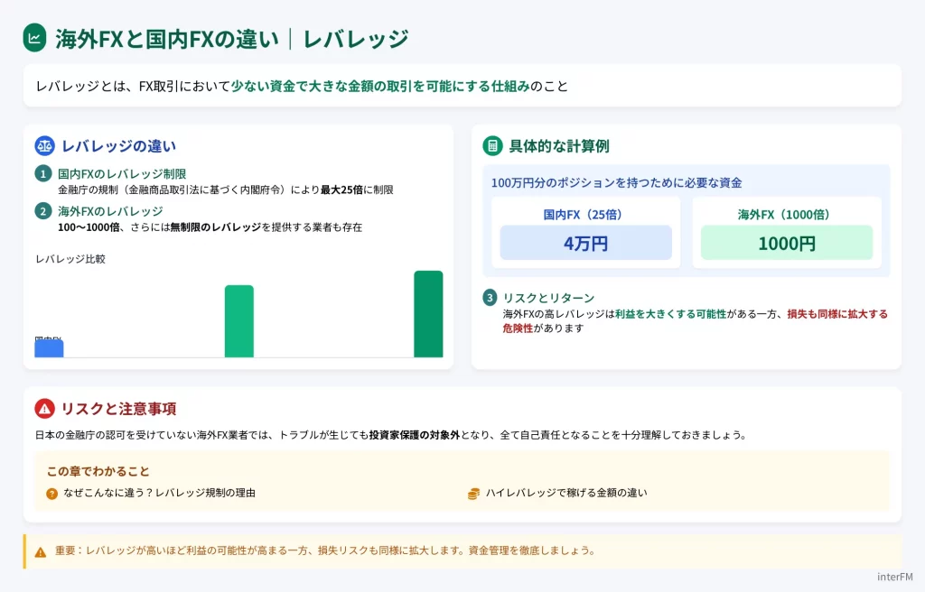 一方、海外FXでは規制の違いから、100倍、500倍、1000倍といった高レバレッジ・無制限レバレッジでの取引が可能です。