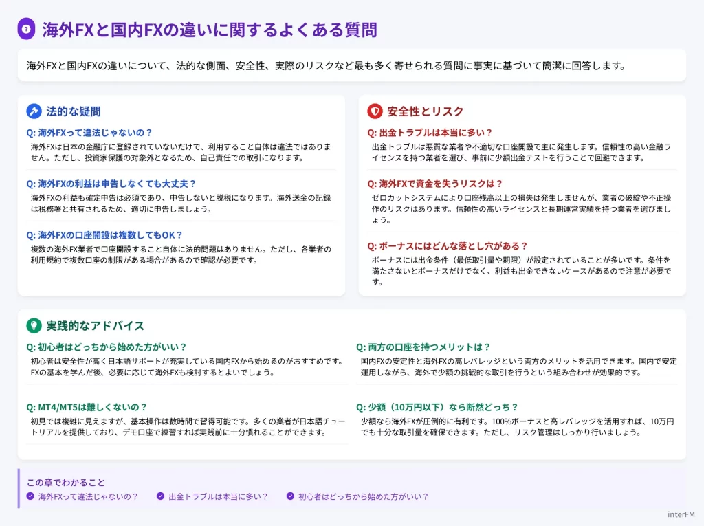 海外FXと国内FXの違いについて検討している投資家の多くは、共通した疑問や不安を抱えています。