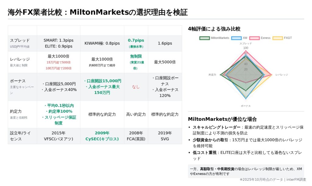 この記事では、SNS・5chのリアルな口コミ分析、XM・Exness・FXGTとの4社比較表、スプレッド実測値と約定スピードの検証、出金トラブルの実態調査、30%出金可能ボーナスの詳細条件など、MiltonMarketsの評判を多角的に徹底解説します。