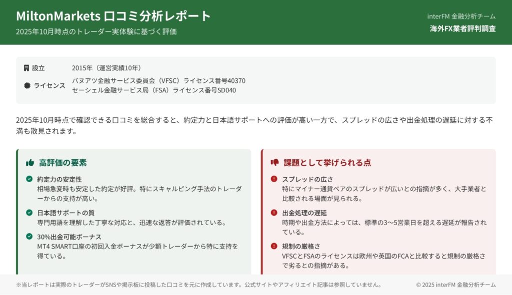 特にMiltonMarketsは約定力に定評がある一方、スプレッドや出金対応への不満の声もあり、メリット・デメリットを正確に把握することが重要です。