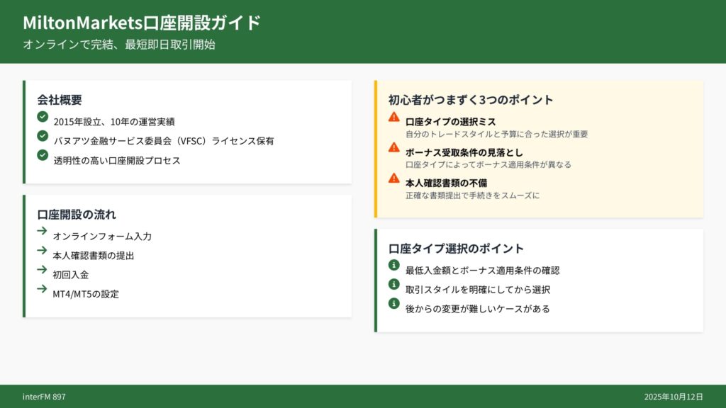 この記事を読めば、MiltonMarketsが自分のトレードスタイルに合うか客観的に判断でき、口座タイプの選び方から失敗しない開設手順まで、安心してスタートできるようになります。