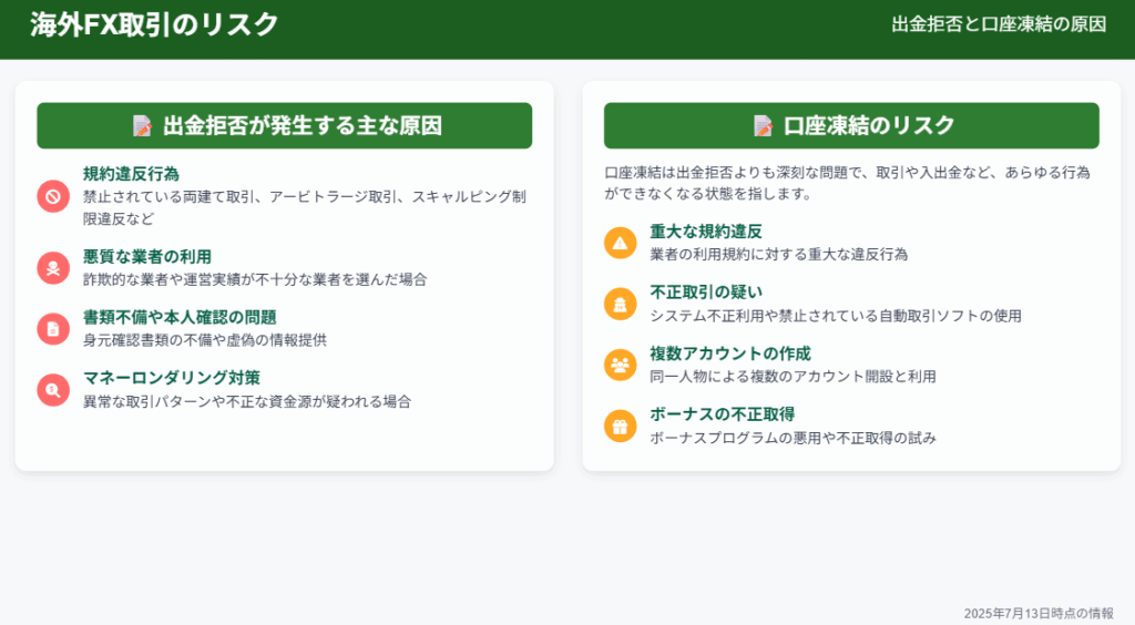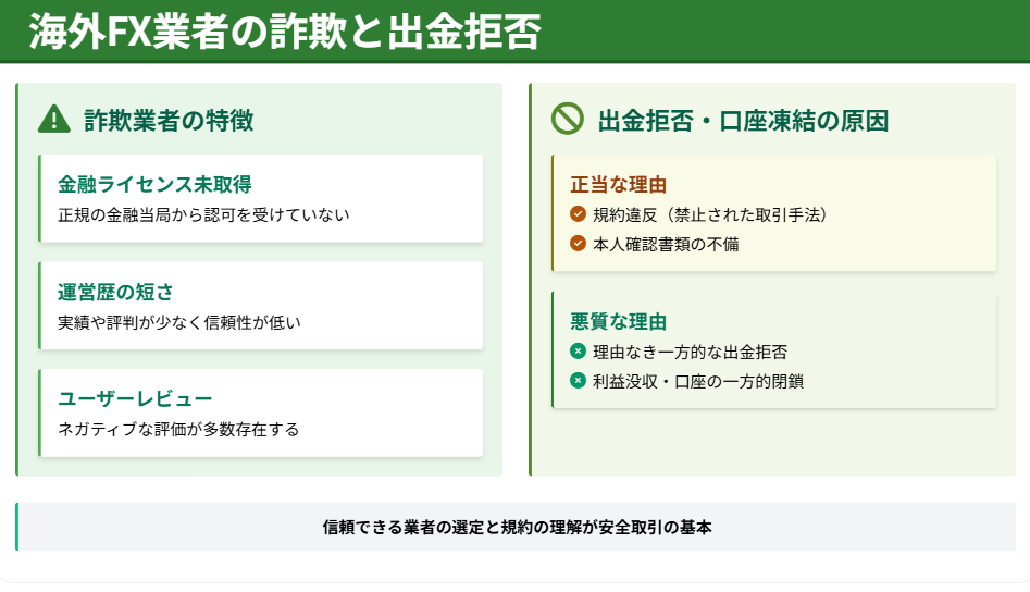 海外FXにおいて最も心配される問題の一つが、出金拒否や口座凍結のリスクです。