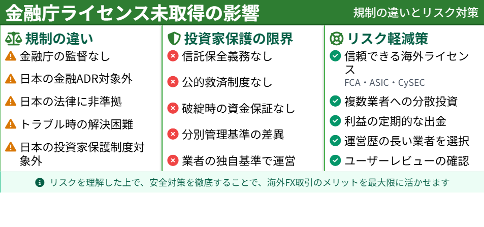 つまり、日本居住者が海外FX口座を開設・利用すること自体は違法ではありませんが、金融庁の監督下にない業者を利用することになるため、様々なリスクが伴うということを理解しておく必要があります。