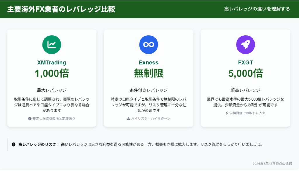 国内FXは最大25倍のレバレッジに制限されているのに対し、海外FXでは数百倍から数千倍のレバレッジが提供されています