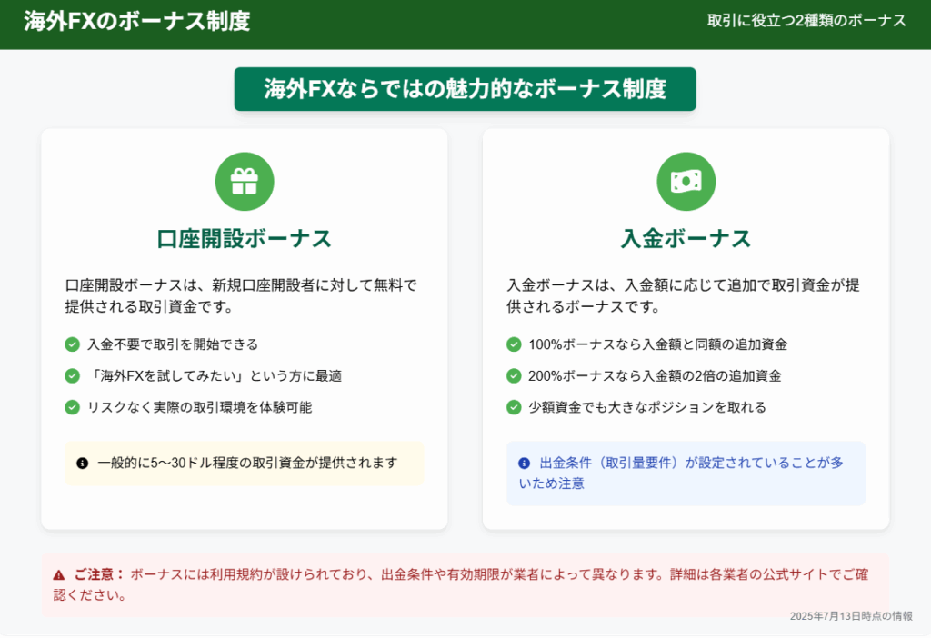 税制面では国内FXの方が有利ですが、取引条件やボーナスでは海外FXに魅力がありますね