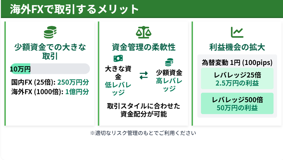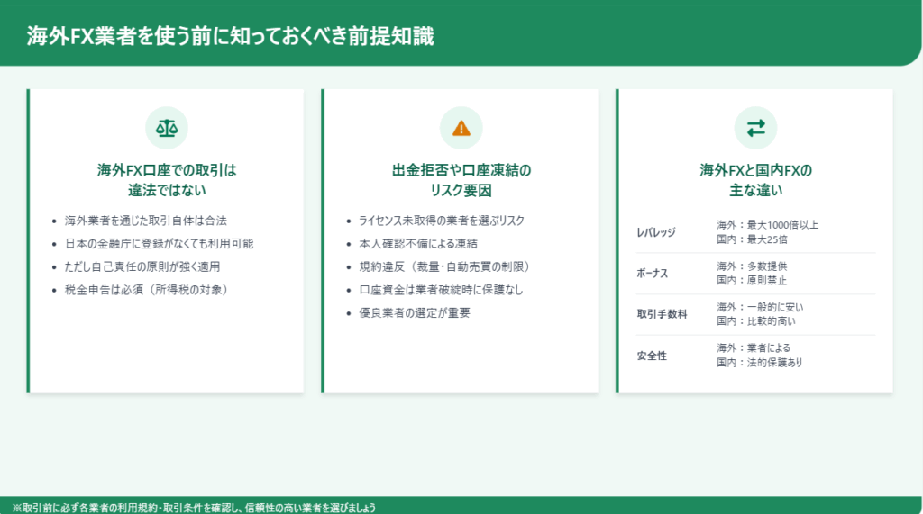海外FXは国内FXとは異なる特徴があり、高いレバレッジを活用できる反面、特有のリスクも存在します