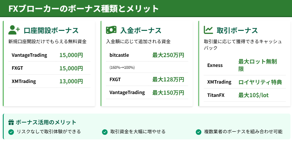 海外FX業者のボーナスキャンペーンでは、ボーナスキャンペーンを幅広く開催しています。