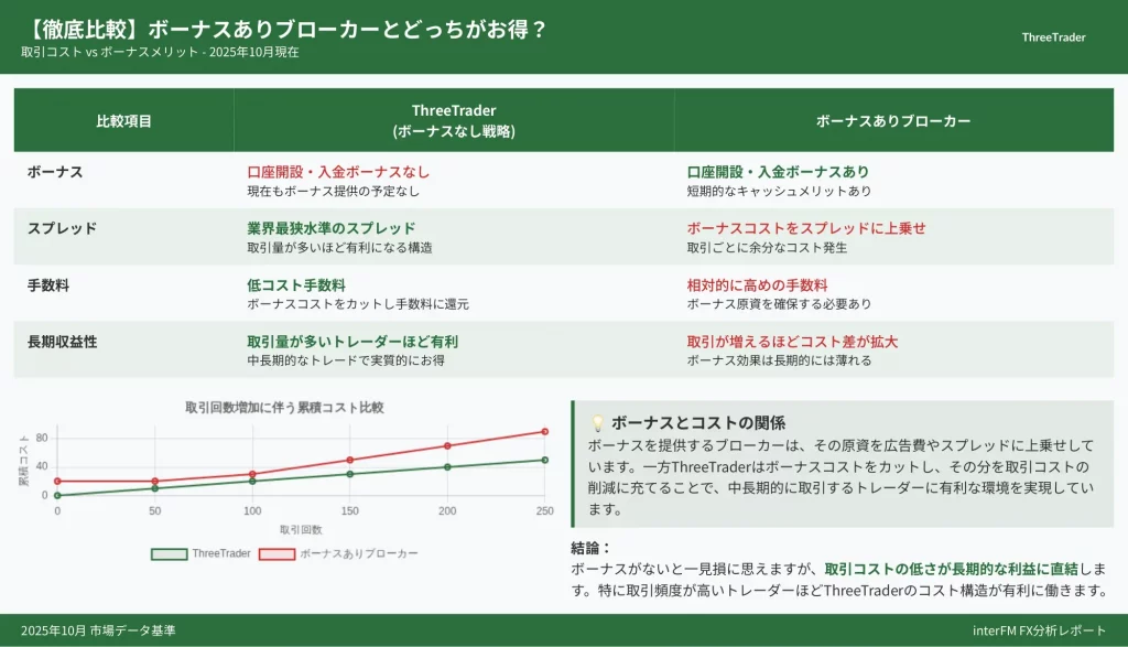 ThreeTraderが本当にお得なのか、それとも他社ボーナスを活用すべきなのか、具体的な数値根拠に基づいた正しい判断ができるようになるでしょう。
