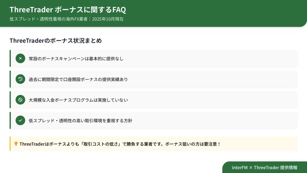 ThreeTrader(スリートレーダー)は2025年11月現在、口座開設ボーナスや入金ボーナスなどの常設キャンペーンを一切提供していません。