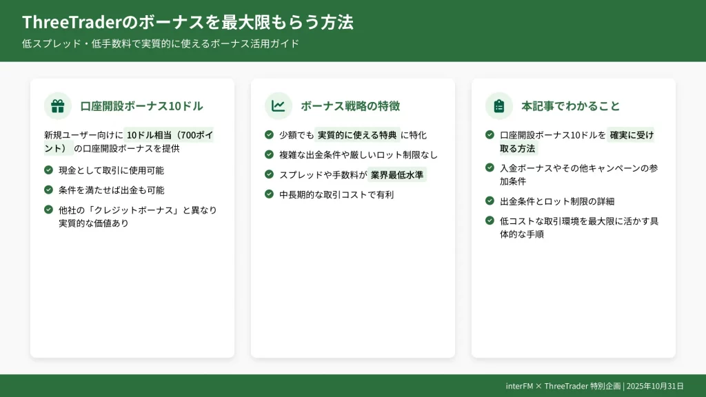 この記事では、2025年11月現在のThreeTraderの最新ボーナス提供状況を即答した上で、なぜThreeTraderがボーナスを抑えているのかビジネスモデルの観点から徹底解説します。