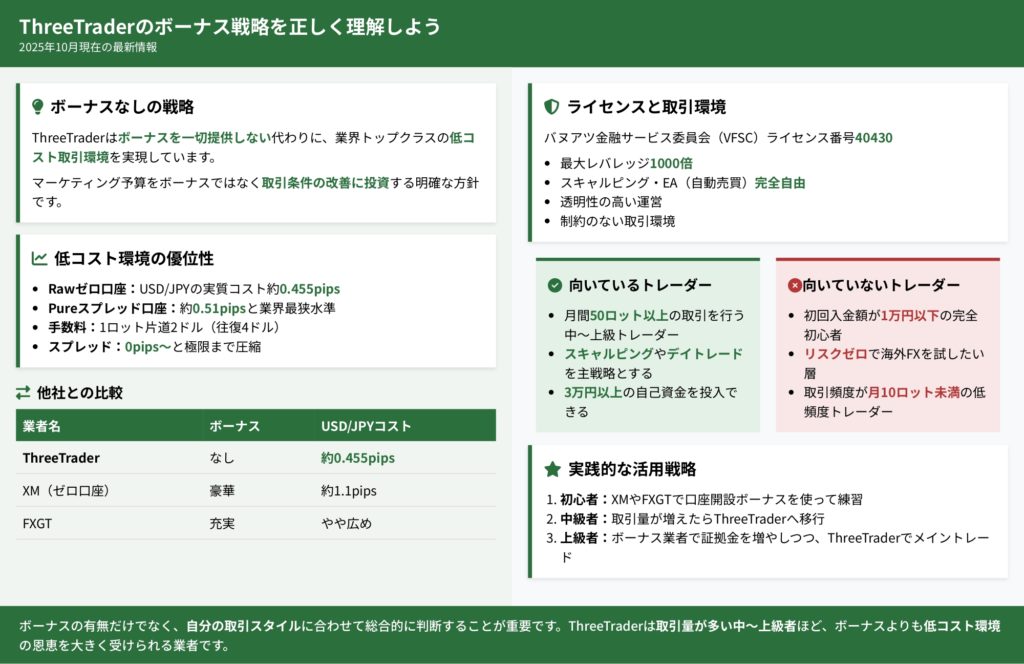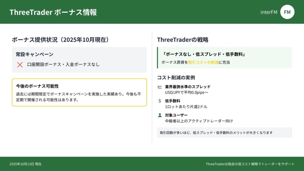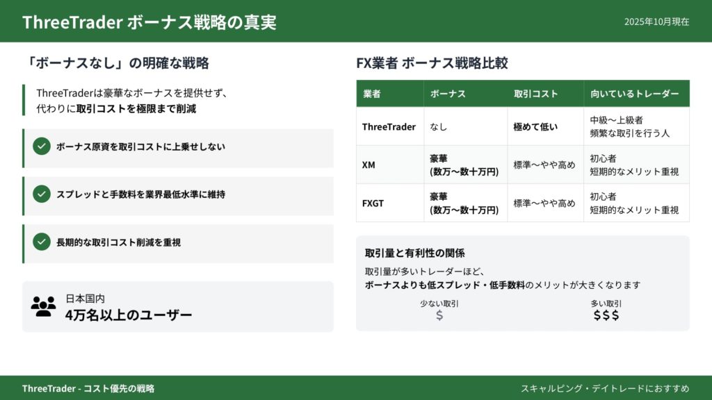 ThreeTraderは「ボーナスなし・低スプレッド・低手数料」という明確な戦略を取っており、ボーナス原資を取引コストの削減に充てることで、中級者以上のアクティブトレーダーに支持されています。