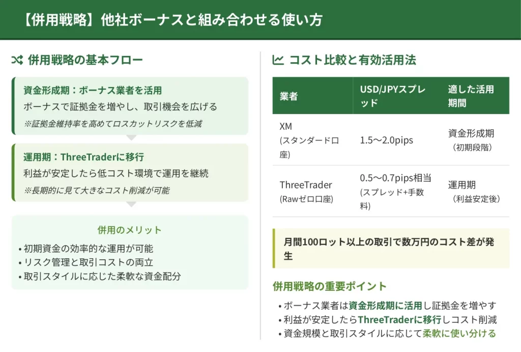 あるいは、ボーナス業者で証拠金を増やしつつ、実際のメイントレードはThreeTraderで低コスト運用する「ハイブリッド戦略」も、中級者以上には効果的と言えます。