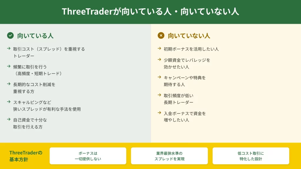 逆に、ThreeTraderが向かないケースも明確です。