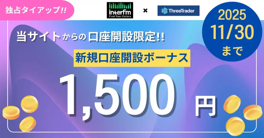 2025年11月現在、ThreeTrader(スリートレーダー)では口座開設ボーナスや入金ボーナスなどの常設キャンペーンは提供されていません。