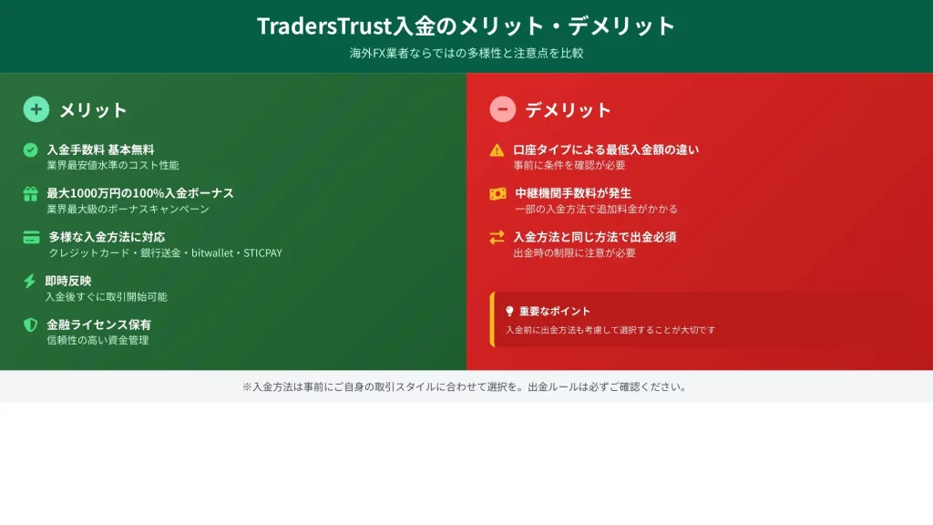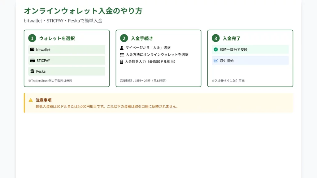 TradersTrustでは複数の入金方法が用意されており、それぞれに異なる特徴があります。