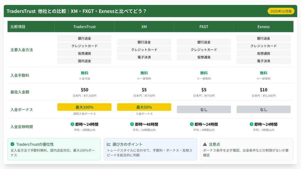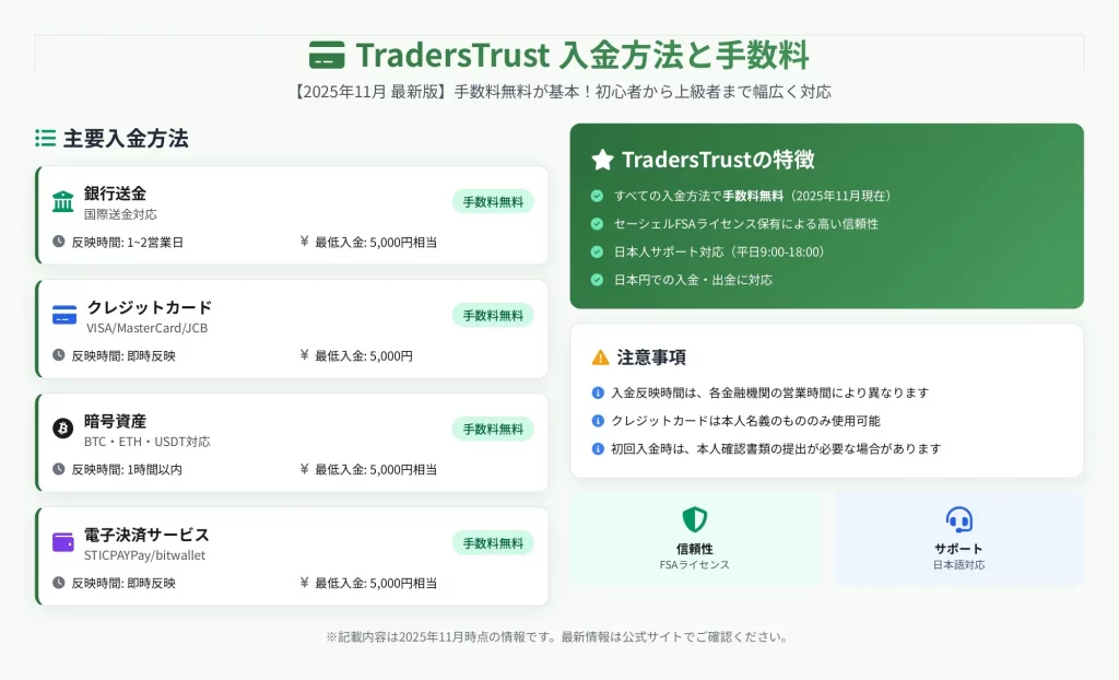 公式サイトの情報に基づき、2025年11月時点の最新対応状況を正確にお伝えしますので、TradersTrustでの入金を検討している方は、ぜひ参考にしてください。