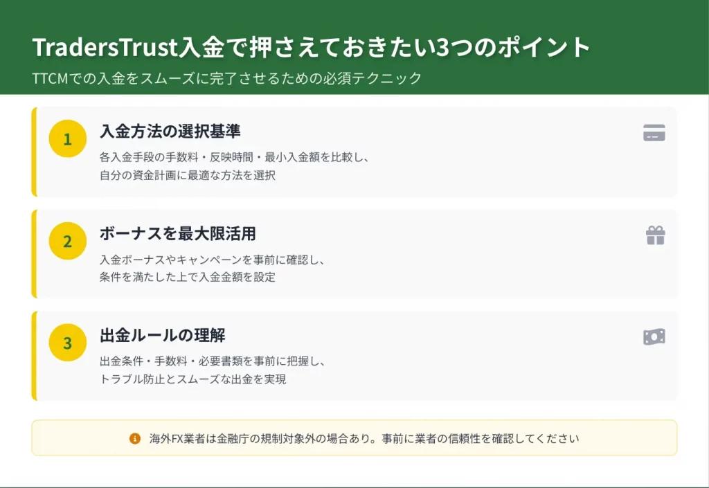 まとめ|TradersTrust入金で押さえておきたい3つのポイント