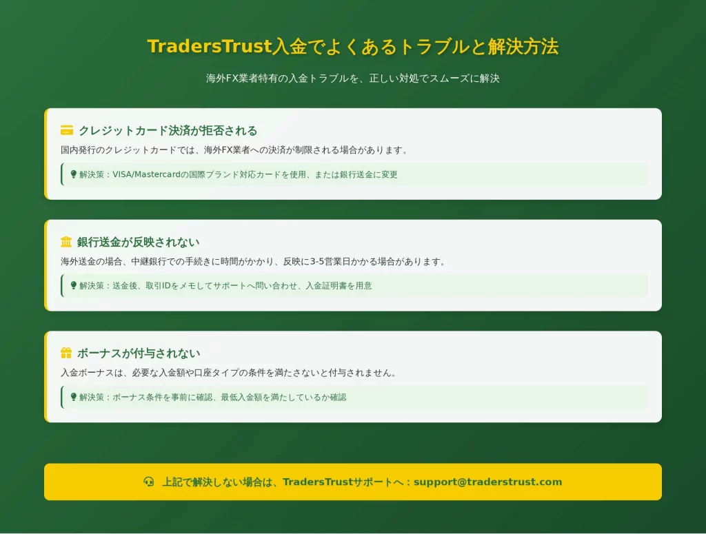 TradersTrustで入金したいけれど、どの方法を選べばいいのか分からない、手数料や反映時間が気になる、クレジットカードが使えるのか不安、最大1000万円のボーナスを確実に受け取りたいと悩んでいませんか?